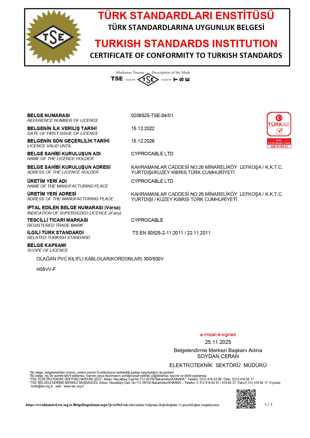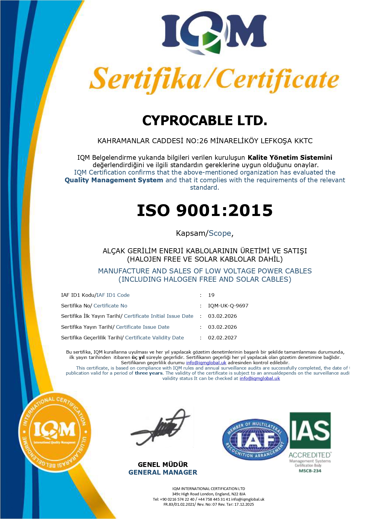 Cyprocable; kalite, müşteri memnuniyeti ve enerji yönetiminin bir takım çalışması olduğu bilinci ile ISO 9001 Yönetim Sistemi standartlarının gerekliliklerini yerine getirmektedir.Bu prensip dahilinde kalite politikalarımız ;